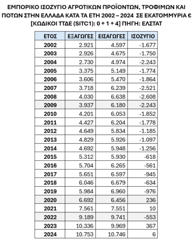 Οι Βρυξέλλες δικαιολογούν αυτή την απόφαση με το επιχείρημα ότι οι αγρότες στην ΕΕ είναι μόνο το 3,8% του οικονομικά ενεργού πληθυσμού, ενώ στη βιομηχανία απασχολείται το 24%. Στην Ελλάδα, όμως, οι επαγγελματίες αγρότες καταλαμβάνουν το 9% της απασχόλησης (ΕΛΣΤΑΤ 2021) και άλλο 9% καταλαμβάνουν και οι εργαζόμενοι στη μεταποίηση, αλλά το 40% της Ελληνικής μεταποίησης σχετίζεται με τα τρόφιμα. Η απομάκρυνση των δασμών θα διευρύνει το έλλειμμα του ισοζυγίου εξαγωγών – εισαγωγών αγροτικών προϊόντων, τροφίμων και ποτών της Ελλάδας σε καταστροφικά επίπεδα όχι μόνο για την πρωτογενή παραγωγή, αλλά και για την Εθνική Οικονομία, καθώς ελλείμματα του εμπορικού ισοζυγίου αγροτικών προϊόντων, τροφίμων και ποτών άνω των 2 δις ευρώ συνέβαλαν στη χρεωκοπία της χώρας το 2009 (βλέπε συνημμένο πίνακα).
